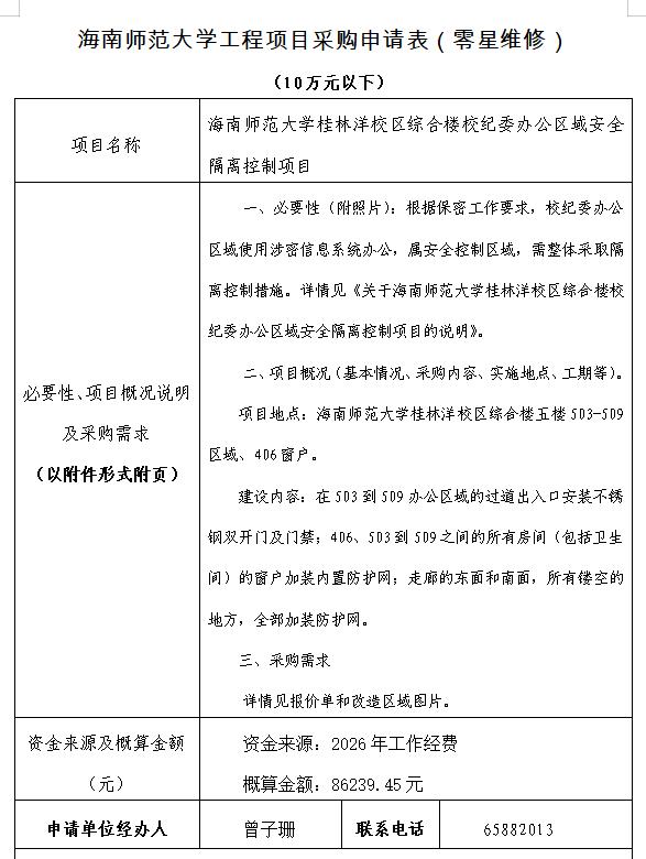 关于采购海南师范大学桂林洋校区综合楼校纪委办公区域安全隔离控制项目的公示